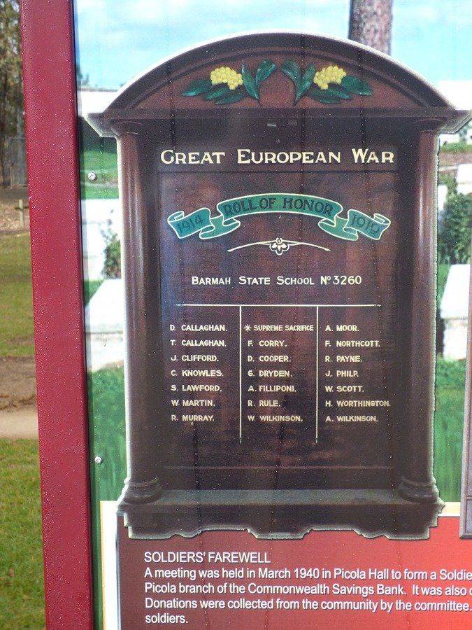 A sign next to the monument displays pictures of two honour rolls from Barmah.